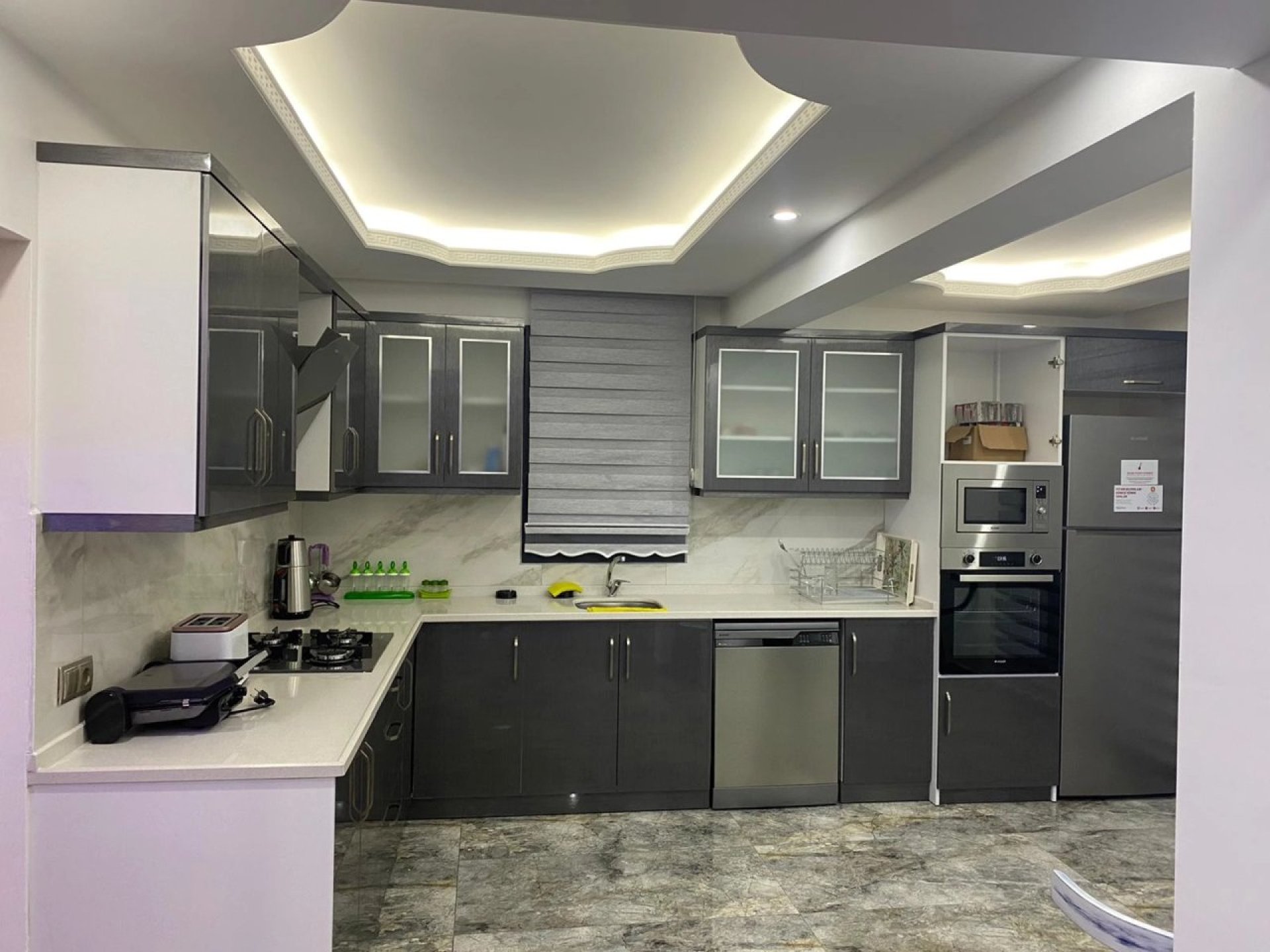 The kitchen includes a refrigerator, built-in oven, microwave, dishwasher, built-in 4-burner stove, tea maker, pans, pots, cutlery, and essential kitchen equipment.